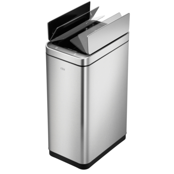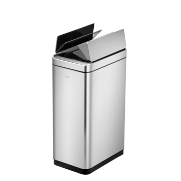 Fijne afvalbak met grote opening als het deksel open gaat. Jammer dat hij niet handmatig geopend kan worden als de batterijen leeg zijn.