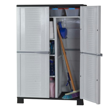 Berg je schoonmaak- of tuingerei op in deze combi opbergkast van Eldir. De uniek kast is gemaakt uit grijze kunststof en kan weer en wind aan, zodat je 'm ook het hele jaar door buiten kan zetten. De bijgeleverde planken zijn in hoogte verstelbaar. Makkelijk in elkaar te zetten. Kan zo'n 60 kilogram aan gerei aan.