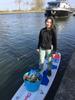 Roos vist zwervuil. Met haar SUP (Stand Up Paddleboard). Dat doet ze op het kanaal van Brugge naar Oostende. De flexibele emmers zijn ideaal om mee te nemen op de sup en het afval dat uit het water gevist wordt, in te gooien. En het vrolijke kleurtje past uitstekend op de SUP.