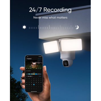 De camera is IP65-weerbestendig en werkt via vaste stroom. Daardoor kan hij dag en nacht blijven opnemen, bij elk weertype. Beelden worden lokaal opgeslagen op een microSD-kaart tot 128 GB (niet inbegrepen) of via de optionele HomeBase 3 (S380) voor extra opslag en slimme functies. Let op: de Eufy E30 Floodlight kan zelfstandig gebruikt worden, maar kan ook gekoppeld worden aan de HomeBase 3 voor meer mogelijkheden. Je betaalt geen maandelijkse kosten voor opslag of abonnement.