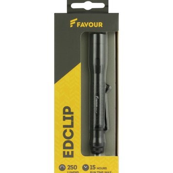 De EDCLIP T2222 van FAVOUR is een onmisbare aanwinst voor je dagelijkse uitrusting als je vaak in kiertjes en hoekjes moet schijnen. Deze compacte penlight heeft een clip waarmee je hem gemakkelijk aan je werkbroek of riem vastmaakt. Daarnaast rolt de lamp niet weg als je hem even neerlegt. Met de tail switch schakel je tussen twee lichtstanden van fel naar minder fel licht. Op de hoge lichtstand produceert de zaklamp een lichtopbrengst van maar liefst 250 lm, op de lage stand is dit 30 lm. De bundelreikwijdte is 90 m en de zaklamp gaat 15 uur mee. Ook fijn om te weten is dat de zaklamp tot 2 meter valbestendig is. Laat je de zaklamp van bijvoorbeeld de steiger vallen? Geen enkel probleem, hij kan er tegen. Mocht hij in de modder terecht komen, ook geen probleem. De IP66 rating zorgt ervoor dat de zaklamp stof- en waterdicht is.