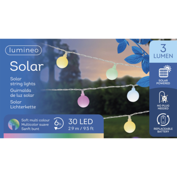 Breng direct sfeer in je tuin, balkon of terras met deze Lumineo solar lichtslinger. Het transparante snoer met 30 zachte, meerkleurige LED-bulbs creëert moeiteloos een warme en feestelijke ambiance. Dankzij de zonne-energie werkt de slinger volledig draadloos en duurzaam, met een brandtijd tot wel 6 uur. De stevige kunststof bulbs zijn weerbestendig en eenvoudig te plaatsen, waardoor je zonder moeite geniet van een gezellige buitenomgeving.