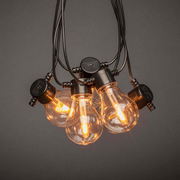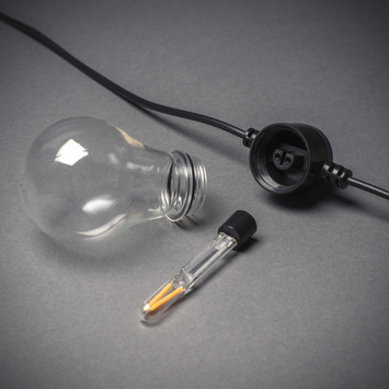 Maak een extra gezellig en sfeervol feestje met deze fantastische, in 4 standen dimbare Power LED feestverlichting. Een krachtig maar warm en sfeervol licht creeer je moeiteloos met dit trendy en zeer energiezuinige feestverlichtingsnoer. Dit semi professionele PowerLED lichtsnoer met 10 transparante bollen -elk met een dimbare en vervangbare extra warmwitte 2200K twin PowerLED lichtbron- is 4.5 meter lang. De verlichte bollen hebben een hoge lichtoutput gedurende de hele levensduur en zijn op 4 standen dimbaar (25%-50%-75%-100%). De kabel is een zwarte 24V kabel met een hoge trek en wringbelasting. De afstand tussen de lichtbronnen is 50cm. De PowerLED lichtbronnen zijn in het midden van de transparante bollen geplaatst voor maximale lichtspreiding. De bollen zijn van kunststof en dus niet breekbaar. Het aansluitsnoer tot aan de eerste lichtbron is 10 meter lang, dus bijna altijd zonder verlengsnoer op een stopcontact aan te sluiten. Het snoer is zeer energiezuinig met een verbruik van slechts 6W en heeft energielabel A. Het snoer kan binnen en buiten worden gebruikt (IP44 rating tegen vocht en stof). Het is niet geschikt voor gebruik in of onder water.