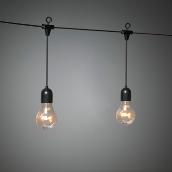 Maak een extra gezellig en sfeervol feestje van alle (buiten) activiteiten met dit trendy, decoratieve en energiezuinige feestverlichtingsnoer. Dit modieuze en duurzame LED lichtsnoer met 20 transparante bollen -elk met 8 extra warmwitte 2200K LED lichtbronnen- is 9.5 meter lang. De verlichte bollen hebben een hoge lichtoutput gedurende de hele levensduur en zijn verbonden aan de hoofdkabel met een verticaal snoertje van 40cm lengte. De afstand tussen de verticale snoeren is 50cm. De 8 LEDs per lichtbron zijn midden in de bol geplaatst voor maximale lichtspreiding. De bollen zijn van kunststof en dus niet breekbaar. De hoofdkabel is voorzien van ophangoogjes voor eenvoudige wand of plafondmontage. De kabelkleur is zwart. Het aansluitsnoer tot aan de eerste lichtbron is 10 meter lang, dus bijna altijd zonder verlengsnoer op een stopcontact aan te sluiten. Het snoer is zeer energiezuinig met een verbruik van slechts 3W en heeft energielabel A. Het snoer kan binnen en buiten worden gebruikt (IP44 rating tegen vocht en stof).