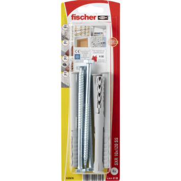 Met deze deeldraad SXR 10x120 SSK zeskantschroeven en kozijnplug met kraag van fischer kan je van alles ophangen. De kozijnpluggen zijn te gebruiken op verschillende soorten materialen zoals beton, gipssplaten en natuursteen. Ze zijn handig voor houten platen vanwege de deeldraadschroef, waarmee je ze zonder voorboren of voorspannen in hout kunt boren. De pluggen zijn te belasten tot 160 kg afhankelijk van het materiaal. Gebruik voor het boren van het gat een boor met een diameter van 10 mm. De plug is 120 mm lang en de deeldraadschroef is 127 mm lang met een diameter van 7 mm. De verpakking bevat 4 deeldraadschroeven inclusief kozijnpluggen