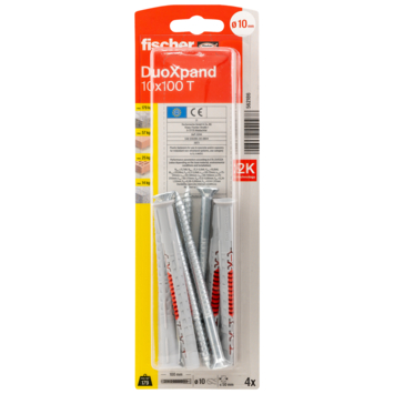 De fischer Constructieplug DuoXpand met dubbele verankeringsdiepte is gecertificeerd voor meervoudige bevestiging van niet-dragende systemen in beton, metselwerk én cellenbeton. Dankzij de speciale geometrie en het gebruik van verschillende kunststoffen, past de plug zich perfect aan de ondergrond aan. De DuoXpand met verzonken kop is zeer geschikt voor het bevestigen van houten aanbouwdelen in metselwerk of beton.
