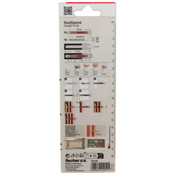 De fischer Constructieplug DuoXpand met dubbele verankeringsdiepte is gecertificeerd voor meervoudige bevestiging van niet-dragende systemen in beton, metselwerk én cellenbeton. Dankzij de speciale geometrie en het gebruik van verschillende kunststoffen, past de plug zich perfect aan de ondergrond aan. De DuoXpand met verzonken kop is zeer geschikt voor het bevestigen van houten aanbouwdelen in metselwerk of beton.
