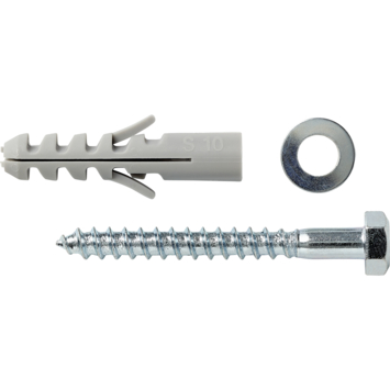 Deze WL 7x65 radiatorbevestiging van Fischer bestaat uit schroeven en pluggen waarmee je radiatoren gemakkelijk ophangt. De pluggen en schroeven zijn te gebruiken op verschillende soorten materialen zoals beton, gipsplaten en natuursteen. De pluggen zijn maximaal te belasten tot 83kg, afhankelijk van het materiaal. Gebruik voor het boren van het gat een boor met een diameter van 10mm. De plug is 50mm lang, en de schroef is 65mm en heeft een diameter van 7mm. Eén verpakking bevat 4 schroeven inclusief pluggen en carrosserie-ringen.