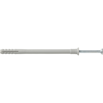 Deze Fischer-nagelplug N8x120X, verpakt per 50 stuks, gebruikt je voor het monteren van houten regelwerk op verschillende materialen. Denk aan betonnen wanden, wandverbindingen en metalen profielen. Gebruik voor het boren van het gat waarin je de nagelplug aanbrengt, een boor met een diameter van 8mm. De 120mm lange nagelplug breng je aan en vervolgens de schroef van 125mm met een diameter van 5mm. Na montage is deze nagelplug met een lengte van 12cm, afhankelijk van het materiaal waarin je de plug bevestigt, te belasten tot maximaal 27kg. Je koopt de Fischer-nagelplug N8x120X per 50 nagelpluggen.
