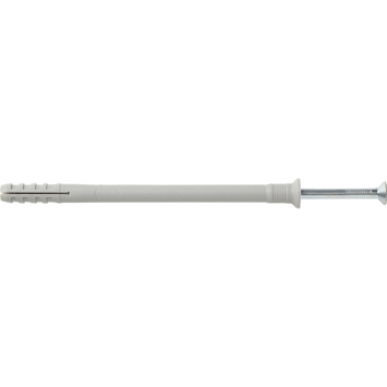 Deze N 8x120mm/80 S slagpluggen van Fischer zijn geschikt voor verschillende soorten materialen zoals beton, wandverbindingen en metaal. Slagpluggen, ook wel bekend als spijkerpluggen of nagelpluggen, zijn zeer geschikt voor het monteren van houten regelwerk (zoals plinten). Je slaat de plug namelijk met een hamer in het boorgat. De slagpluggen zijn te belasten tot maximaal 27kg, afhankelijk van het materiaal. De slagpluggen zijn maximaal te belasten tot 27kg afhankelijk van het materiaal. Gebruik voor het boren van het gat een boor met een diameter van 8mm. De plug is 120mm lang, de bijgeleverde schroeven zijn 125mm lang en hebben een diameter van 5mm. Eén verpakking bevat 6 slagpluggen.
