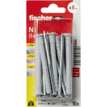 Deze N 8x80/40 S slagpluggen van Fischer zijn geschikt voor verschillende soorten materialen zoals beton, wandverbindingen en metaal. Slagpluggen, ook wel bekend als spijkerpluggen of nagelpluggen, zijn zeer geschikt voor het monteren van houten regelwerk (zoals plinten). Je slaat de plug namelijk met een hamer in het boorgat. De pluggen zijn maximaal te belasten tot 27kg, afhankelijk van het materiaal. Gebruik voor het boren van het gat een boor met een diameter van 8mm. De plug is 80mm lang, de bijgeleverde schroeven zijn 85mm lang en hebben een diameter van 5mm. Eén verpakking bevat 10 slagpluggen.