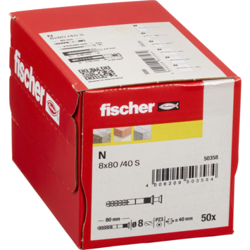 Deze Fischer-nagelplug N8x80Z, verpakt per 50 stuks, gebruikt je voor het monteren van houten regelwerk op verschillende materialen. Denk aan betonnen wanden, wandverbindingen en metalen profielen. Gebruik voor het boren van het gat waarin je de nagelplug aanbrengt, een boor met een diameter van 8mm. De 80mm lange nagelplug breng je aan en vervolgens de schroef van 85mm met een diameter van 5mm. Na montage is deze nagelplug met een lengte van 6cm, afhankelijk van het materiaal waarin je de plug bevestigt, te belasten tot maximaal 27kg. Je koopt de Fischer-nagelplug N8x80Z per 50 nagelpluggen.