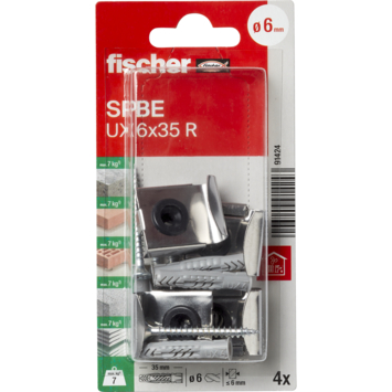 De fischer Spiegelbevestiging SPBE K bestaat uit verchroomde spiegelhouders met kurklaag voor boven en onder om contactcorrosie tussen de spiegel en de klem te voorkomen. Bevestiging met behulp van Universeelpluggen UX en bijpassende schroeven voor een goed houvast in vrijwel alle bouwmaterialen.