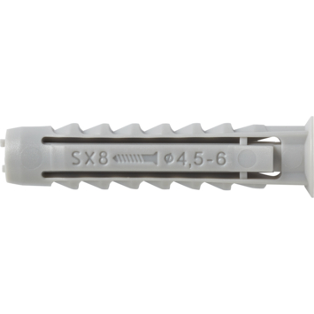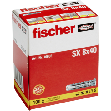 Dankzij de vierzijdige spreiding is de Fischer SX-plug van nylon een krachtige 8mm-plug waarmee u voorwerpen stevig bevestigt. De SX-pluggen krijgt u geleverd per 100 stuks. De plug met vierzijdige spreiding is geschikt voor montage in beton en massieve steen, maar ook in holle steen en porenbeton. U bevestigt de plug dan in combinatie met een spaanplaatschroef. Het is mogelijk om middelzware tot zware voorwerpen te monteren met deze SX-pluggen van Fischer en passende schroeven. Denk aan schilderijen, lampen, brievenbussen en kleine legplanken of bad- en toiletmontages, kledingkasten en rolluiken. De 100 Fischer-pluggen hebben een lengte van 40mm, een diameter van 8mm en kunnen een maximale belasting van 70kg aan, afhankelijk van het materiaal. De verpakking met nylon SX-pluggen bevat in totaal 100 pluggen.
