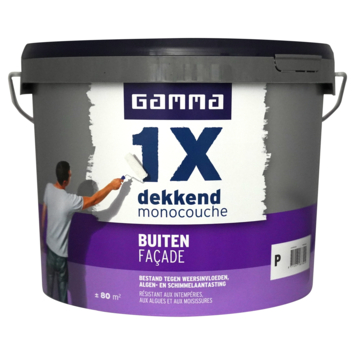 GAMMA 1x dekkend buiten (façade) muurverf mat 10 liter is een uitstekend dekkende, weerbestendige en matte muurverf. Ideaal voor het schilderen van buitengevels en muren. De schimmelwerende ingrediënten van de verf zorgen voor een beschermende laag die de muur beschermt tegen weersinvloeden, algen- en schimmelaantasting.