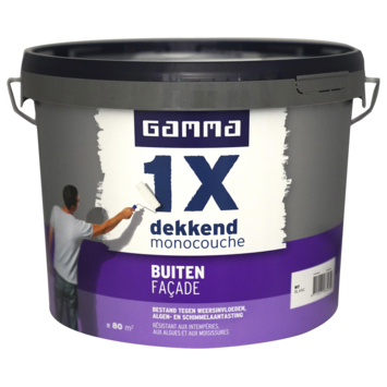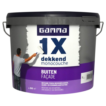 GAMMA 1x dekkend buiten (façade) muurverf mat wit 10 liter is een uitstekend dekkende, weerbestendige en matte muurverf. Ideaal voor het schilderen van buitengevels en muren. De schimmelwerende ingrediënten van de verf zorgen voor een beschermende laag die de muur beschermt tegen weersinvloeden, algen- en schimmelaantasting.