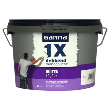 GAMMA 1x dekkend buiten (façade) muurverf mat wit 2,5 liter is een uitstekend dekkende, weerbestendige en matte muurverf. Ideaal voor het schilderen van buitengevels en muren. De schimmelwerende ingrediënten van de verf zorgen voor een beschermende laag die de muur beschermt tegen weersinvloeden, algen- en schimmelaantasting.