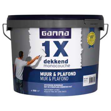 GAMMA 1x dekkend muur & plafond latex mat RAl 9016 10 liter is de beste keuze voor een strak en egaal eindresultaat. GAMMA 1x dekkend is een optimaal dekkende, afneembare (schrobklasse 2) en matte muurverf. Universeel toepasbaar voor muren en plafonds in droge ruimtes binnenshuis zoals de woon- of slaapkamer. De GAMMA latex 1x dekkend muur & plafond heeft altijd een strak en steeploos eind resultaat. Verfbanen en strepen vloeien tijdens het drogen naadloos in elkaar over. Afhankelijk van kleur en kwaliteit van de ondergrond dekt deze verf in één laag. Bij donkere of felle kleuren heb je meer verflagen nodig voor een optimale dekking. GAMMA latex 1x dekkend muur & plafond is beschikbaar in de kleuren Wit, RAL 9010 Gebroken wit en RAL 9016 Verkeerswit.