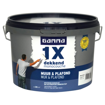 GAMMA 1x dekkend muur & plafond latex RAL 9016 verkeerswit 2,5 liter is de beste keuze voor een strak en egaal eindresultaat. GAMMA 1x dekkend is een optimaal dekkende, afneembare (schrobklasse 2) en matte muurverf. Universeel toepasbaar voor muren en plafonds in droge ruimtes binnenshuis zoals de woon- of slaapkamer. De GAMMA latex 1x dekkend muur & plafond heeft altijd een strak en steeploos eind resultaat. Verfbanen en strepen vloeien tijdens het drogen naadloos in elkaar over. Afhankelijk van kleur en kwaliteit van de ondergrond dekt deze verf in één laag. Bij donkere of felle kleuren heb je meer verflagen nodig voor een optimale dekking.GAMMA latex 1x dekkend muur & plafond is beschikbaar in de kleuren Wit, RAL 9010 Gebroken wit en RAL 9016 Verkeerswit.