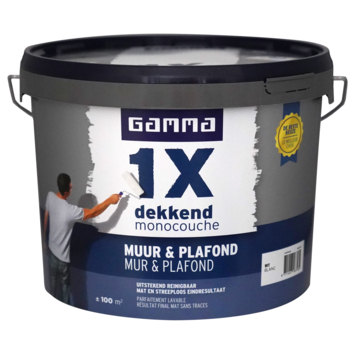 GAMMA 1x dekkend muur & plafond latex mat wit 10 liter is de beste keuze voor een strak en egaal eindresultaat. GAMMA 1x dekkend is een optimaal dekkende, afneembare (schrobklasse 2) en matte muurverf. Universeel toepasbaar voor muren en plafonds in droge ruimtes binnenshuis zoals de woon- of slaapkamer. De GAMMA latex 1x dekkend muur & plafond heeft altijd een strak en steeploos eind resultaat. Verfbanen en strepen vloeien tijdens het drogen naadloos in elkaar over. Afhankelijk van kleur en kwaliteit van de ondergrond dekt deze verf in één laag. Bij donkere of felle kleuren heb je meer verflagen nodig voor een optimale dekking. GAMMA latex 1x dekkend muur & plafond is beschikbaar in de kleuren Wit, RAL 9010 Gebroken wit en RAL 9016 Verkeerswit.