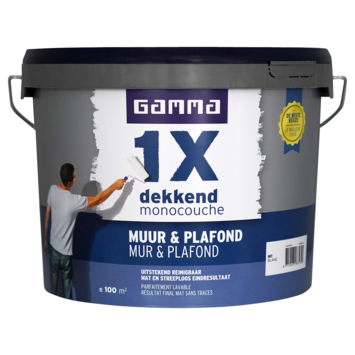 GAMMA 1x dekkend muur & plafond latex mat wit 10 liter is de beste keuze voor een strak en egaal eindresultaat. GAMMA 1x dekkend is een optimaal dekkende, afneembare (schrobklasse 2) en matte muurverf. Universeel toepasbaar voor muren en plafonds in droge ruimtes binnenshuis zoals de woon- of slaapkamer. De GAMMA latex 1x dekkend muur & plafond heeft altijd een strak en steeploos eind resultaat. Verfbanen en strepen vloeien tijdens het drogen naadloos in elkaar over. Afhankelijk van kleur en kwaliteit van de ondergrond dekt deze verf in één laag. Bij donkere of felle kleuren heb je meer verflagen nodig voor een optimale dekking. GAMMA latex 1x dekkend muur & plafond is beschikbaar in de kleuren Wit, RAL 9010 Gebroken wit en RAL 9016 Verkeerswit.