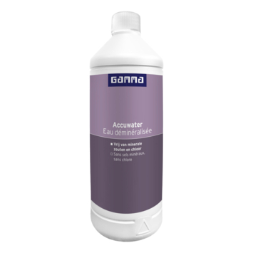 Met het GAMMA accuwater kunt u een niet-onderhoudsvrije accu bijvullen als er water is verdampt. Dit gebeurt tijdens het laden van een accu. Accuwater of demi water is gedemineraliseerd water dat vrij is van zouten en chloor en dus veilig voor uw accu. Het accuwater wordt geleverd in een flacon met een inhoud van 1liter.