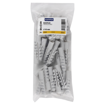 De GAMMA Basisplug nylon Ø 10mm, de meest gebruikte plug voor toepassing in massieve bouwmaterialen, zoals beton en massieve steen. Je koopt de basisplug per 30 stuks. De basisplug is 50mm lang en heeft diepe vertanding. Zo bevestig je met deze plug middelzware materialen aan muren en wanden, bijvoorbeeld schilderijen, plinten en legplanken. Wij adviseren een schroef van tussen 6 en 8mm te gebruiken met een lengte van 60mm. Als minimale boordiepte adviseren wij 60mm aan te houden.