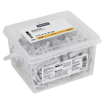 Pluggen nodig voor het bevestigen van objecten aan een muur? GAMMA Basisplug nylon Ø 5, 6, 8 en 10mm voordeelpak bevat maar liefst 400 stuks pluggen voor universeel gebruik. De pluggen zijn geschikt voor bevestiging in beton en massieve steen. Let op dat u het boorgat in de juiste grootte maakt. Hierbij kunt u ervan uitgaan dat het boorgat even groot moet zijn als de diameter van de plug. In dit voordeelpak met grijze pluggen zitten pluggen met verschillende afmetingen: 5, 6, 8 and 10mm. De grote pluggen kunnen meer belast worden dan de kleine pluggen. De pluggen in deze voordeelverpakking met 400 pluggen is gemaakt van nylon.
