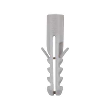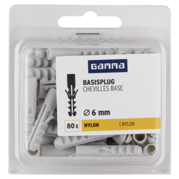De GAMMA Basisplug nylon Ø 6mm, de meest gebruikte plug voor toepassing in massieve bouwmaterialen, zoals beton en massieve steen. U koopt de basisplug per 80 stuks. De basisplug is 30mm lang en heeft diepe vertanding. Zo bevestigt u met deze plug middelzware materialen aan muren en wanden, bijvoorbeeld schilderijen, plinten en legplanken. De Wij adviseren een schroef van tussen 3,5 en 5mm te gebruiken met een lengte van 35mm. Als minimale boordiepte adviseren wij 35mm aan te houden.