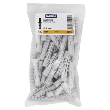 De GAMMA Basisplug nylon Ø 8mm, de meest gebruikte plug voor toepassing in massieve bouwmaterialen, zoals beton en massieve steen. Je koopt de basisplug per 50 stuks. De basisplug is 40mm lang en heeft diepe vertanding. Zo bevestig je met deze plug middelzware materialen aan muren en wanden, bijvoorbeeld schilderijen, plinten en legplanken. Wij adviseren een schroef van tussen 4 en 6mm te gebruiken met een lengte van 45mm. Als minimale boordiepte adviseren wij 45mm aan te houden.