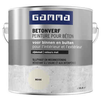 GAMMA Betonverf is een slijtvaste, zijdematte betonverf op waterbasis. Geschikt voor het schilderen van vloeren en wanden van beton of andere steenachtige materialen zoals balkons, trappen en trottoirtegels. De sneldrogende verf is slijtvast en weerbestendig. Gemorste olie, brandstof en zout water direct verwijderen. Niet bestand tegen warme autobanden. Zowel binnen als buiten te gebruiken. Liever een ander kleurtje? Betonverf is in elke gewenste kleur te mengen.