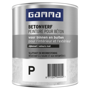 GAMMA Betonverf is een slijtvaste, zijdematte betonverf op waterbasis. Geschikt voor het schilderen van vloeren en wanden van beton of andere steenachtige materialen zoals balkons, trappen en trottoirtegels. De sneldrogende verf is slijtvast en weerbestendig. Gemorste olie, brandstof en zout water direct verwijderen. Niet bestand tegen warme autobanden. Zowel binnen als buiten te gebruiken. Liever een ander kleurtje? Betonverf is in elke gewenste kleur te mengen.