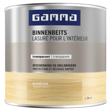 GAMMA Binnenbeits is een kras- en stootvaste transparante beits op waterbasis. Voor het afwerken van (onbehandelde) houten meubels, deuren en kozijnen, plinten, lambriseringen en ander timmerwerk binnenshuis. Beschermt tegen vocht en vlekken en accentueert de houtnerf. Sneldrogend, geur- en oplosmiddelarm. De uiteindelijke kleur is afhankelijk van het soort hout en aantal lagen. Stofdroog na ± 1 uur en overschilderbaar na ± 4 uur. De krasvastheid is, afhankelijk van de kleur, na 15-30 dagen bereikt.