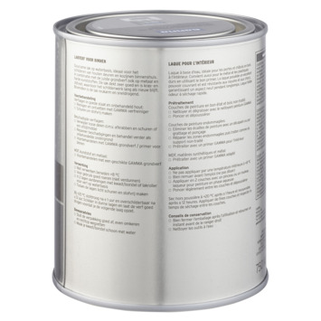 Voor een optimaal resultaat van de GAMMA binnenlak behandel je de ondergrond eerst met GAMMA grondverf voor binnen. Het blik heeft een inhoud van 750 milliliter, dit is voldoende voor een oppervlakte van ongeveer 9 m². Drie uur na het aanbrengen van de verf is deze reeds stofdroog, na 24 uur kan je de volgende laag aanbrengen. Verwerk de verf bij temperaturen tussen de 8 en 25°C.