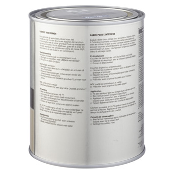 Voor een optimaal resultaat van de GAMMA binnenlak behandel je de ondergrond eerst met de GAMMA grondverf voor binnen. Het blik heeft een inhoud van 750 milliliter, dit is voldoende voor een oppervlakte van ongeveer 9 m². Drie uur na het aanbrengen van de verf is deze reeds stofdroog, na 24 uur kan je de volgende laag aanbrengen. Verwerk de verf bij temperaturen tussen de 8 en 25°C.