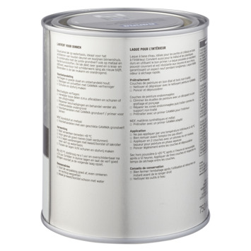 Voor een optimaal resultaat van de GAMMA binnenlak behandel je de ondergrond eerst met GAMMA grondverf voor binnen. Het blik heeft een inhoud van 750 milliliter, dit is voldoende voor een oppervlakte van ongeveer 9 m². Drie uur na het aanbrengen van de verf is deze reeds stofdroog, na 24 uur kan je de volgende laag aanbrengen. Verwerk de verf bij temperaturen tussen de 8 en 25°C.