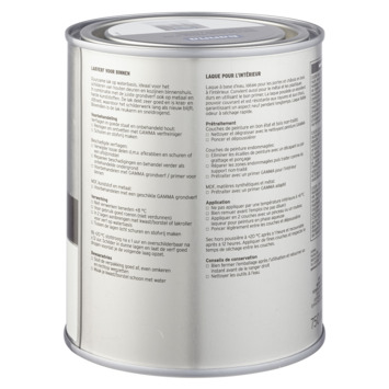 Voor een optimaal resultaat van de GAMMA binnenlak behandel je de ondergrond eerst met GAMMA grondverf voor binnen. Het blik heeft een inhoud van 750 milliliter, dit is voldoende voor een oppervlakte van ongeveer 9 m². Drie uur na het aanbrengen van de verf is deze reeds stofdroog, na 24 uur kan je de volgende laag aanbrengen. Verwerk de verf bij temperaturen tussen de 8 en 25°C.