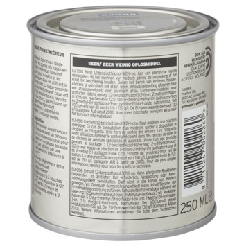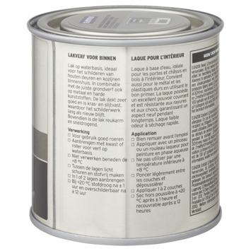 Voor een optimaal resultaat van de GAMMA binnenlak behandel je de ondergrond eerst met GAMMA grondverf voor binnen. Het blik heeft een inhoud van 250 milliliter, dit is voldoende voor een oppervlakte van ongeveer 3 m². Drie uur na het aanbrengen van de verf is deze reeds stofdroog, na 24 uur kan je de volgende laag aanbrengen. Verwerk de verf bij temperaturen tussen de 8 en 25°C.
