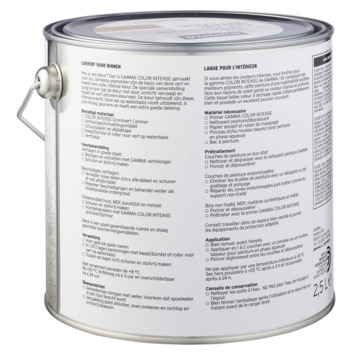 GAMMA Color Intense is een kleurconcept voor binnen schilderwerk van hoge kwaliteit en diepe kleurkracht. Deze GAMMA color intense binnenlak hoogglans 2,5 L gebroken wit is een verf op waterbasis. Verf op waterbasis is de beste keuze voor binnenshuis. Het is geurarm en blijft langer mooi van kleur. Deze verf is geschikt voor hout, en in combinatie met de daarvoor geschikte grondverf, ook voor metaal en kunststoffen. Door gebruik van de beste pigmenten in deze verf, behoud je de diepe en intense kleurkracht. De lak op waterbasis vloeit uitstekend, en heeft een extra goede dekking.