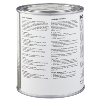 Voor een optimaal resultaat van deze GAMMA Color Intens binnenlak behandel je de ondergrond eerst met de GAMMA Color Intens grondverf. Het blik heeft een inhoud van 750 milliliter, dit is voldoende voor een oppervlakte van ongeveer 7,5 m². Drie uur na het aanbrengen van de verf is deze reeds stofdroog, na 24 uur kan je de volgende laag aanbrengen. Verwerk de verf bij temperaturen tussen de 8 en 25°C.