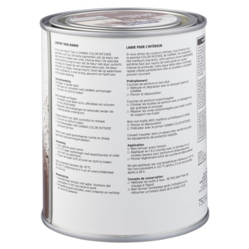 Voor een optimaal resultaat van deze GAMMA Color Intens binnenlak behandel je de ondergrond eerst met de GAMMA Color Intens grondverf. Het blik heeft een inhoud van 750 milliliter, dit is voldoende voor een oppervlakte van ongeveer 7,5 m². Drie uur na het aanbrengen van de verf is deze reeds stofdroog, na 24 uur kan je de volgende laag aanbrengen. Verwerk de verf bij temperaturen tussen de 8 en 25°C.