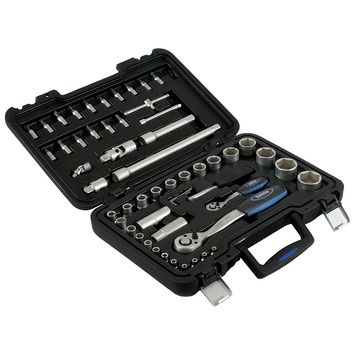 De GAMMA-dopsleutelset met 1/4''- en 1/2"-dopsleutels van 4mm tot 32mm bestaat uit 56 delen. De set bevat 24 dopsleutels, 2 bougiesleutels, 16 dopsleutelbits en diverse accessoires, zoals 2 ratels, een knikstuk en een verlengstuk. De dopsleutels uit deze set zijn gemaakt van hoogwaardig chroom-vanadiumstaal. De stevige dopsleutels hebben zowel een 1/4inch-verbinding, oftewel een verbinding van 6,3mm, als een 1/2inch-verbinding, oftewel een verbinding van 12,7mm. De dopsleutels uit de set hebben een sleutelwijdte variërend van 4mm tot 32mm. In de bijbehorende handige cassette berg je alle dopsleutels, bits en accessoires goed en overzichtelijk op. Kortom, met de dopsleutelset van GAMMA met daarin 1/4inch- en 1/2inch-dopsleutels van 4mm tot 32mm, heb je altijd de juiste dopsleutel bij de hand voor het los- of vastdraaien van iedere moer op iedere plek.