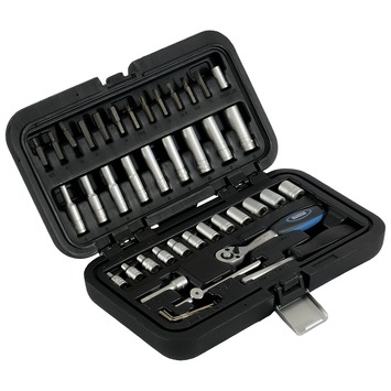 De GAMMA-dopsleutelset met 1/4"-dopsleutels van 3mm tot 13mm bestaat uit 41 delen. De set bevat 21 dopsleutels, 12 bits en diverse accessoires, zoals een ratel, een knikstuk en een verlengstuk. De dopsleutels uit deze set zijn gemaakt van hoogwaardig chroom-vanadiumstaal. 12 van deze stevige dopsleutels hebben een 1/4inch-verbinding, oftewel een verbinding van 6,3mm. Daarnaast bevat de dopsleutelset nog 9 extra lange dopsleutels. De dopsleutels en lange dopsleutels uit de set hebben een sleutelwijdte variërend van 3mm tot 13mm. In de bijbehorende handige cassette berg je alle dopsleutels, bits en accessoires goed en overzichtelijk op. Kortom, met de dopsleutelset van GAMMA met daarin 1/4inch-dopsleutels van 3mm tot 13mm, heb je altijd de juiste dopsleutel bij de hand voor het los- of vastdraaien van iedere moer op iedere plek.