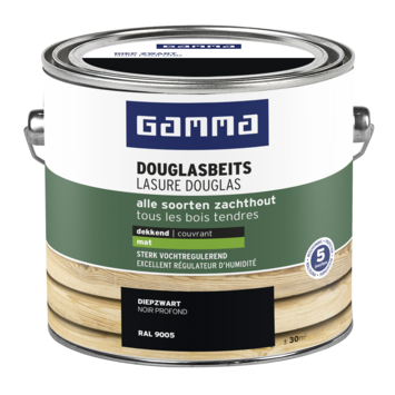 GAMMA Douglasbeits mat RAL 9005 diep zwart 2,5 liter is een dekkende beits met een bescherming tot 5 jaar. Ideaal voor het behandelen van fijn bezaagd of glad geschaafde potdeksel planken van douglas, grenen, vuren, lariks en alle andere soorten zachthout. Op fijn bezaagd hout is schuren niet noodzakelijk tussen de verflagen, oude verflagen voor het verven wel goed reinigen. GAMMA Douglasbeits dringt goed in het hout en maakt het hout sterk vochtregulerend, weerbestendig en waterafstotend. Dekkende beits dekt de houtnerf af, maar blijft wel vochtregulerend. Voorbehandelen met grondverf is niet nodig.