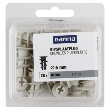 De GAMMA Gipsplaatplug nylon Ø 6mm is geschikt voor het bevestigen van lichte materialen in gipsplaten. Denk aan fotolijstje, schilderijen, lampen, en elektrische installaties. Met behulp van de handige boorpunt monteert u de pluggen snel en eenvoudig. Zodra de metalen plug van 20mm lang in de gipsplaat is gedraaid, schroeft u er een passende schroef in. Voor het beste resultaat adviseren wij schroeven te gebruiken van tussen 3,5 en 4mm met een lengte van 22mm De gipsplaatpluggen van metaal van GAMMA koopt u per verpakking van 20 stuks.