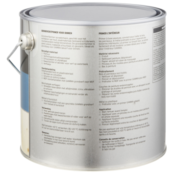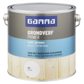 De GAMMA grondverf 2,5L wit is een prima basis voor goed schilderwerk binnenshuis. Je beschermt het houtwerk, plaatmateriaal, bestaand schilderwerk en voorbehandeld metaal binnenshuis optimaal door de ondergrond voor te behandelen met deze grondverf. Door het gebruik van GAMMA grondverf op waterbasis hecht de afwerklaag beter en je krijgt een mooier eindresultaat met een goede en egale dekking. Het is een watergedragen verf, makkelijk schuurbaar en geurarm en daardoor de ideale grondverf voor al het houtwerk binnenshuis. Het blik heeft een inhoud van 2,5 liter dit is voldoende voor een oppervlakte van ongeveer 25 m². De grondverf is na 1 uur stofdroog en na 6 uur overschilderbaar. De verf kan je het beste verwerken bij een temperatuur tussen de 8 en 25°C. Werk het liefst bij daglicht om geen stukjes oppervlak te missen. Schilder hout altijd in de richting van de houtnerf. De grondverf is eenvoudig aan te brengen met een kwast of lakroller voor verf op waterbasis. Deze koop je bij de dichtstbijzijnde GAMMA of via de webshop.