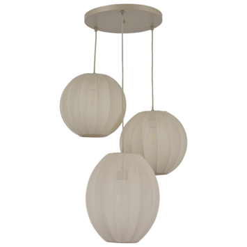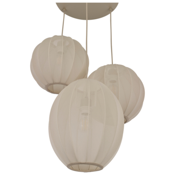 GAMMA hanglamp Emma bestaat uit drie draadkappen van metaal met stof. De lamp heeft 3 lichtpunten welke elk op een andere hoogte hangen. De draadkap omsluit de lamp binnenin, waarna de stoffen zakken over de metalen vormen wordt geschoven. Doordat de stof gedeeltelijjk transparant is onstaat een fascinerend spel van licht en schaduw zodra het licht wordt ingeschakeld. Let op: de afgebeelde lichtbronnen zijn niet inbegrepen.