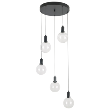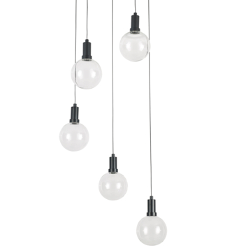 Hanglamp Yves heeft een plafondplaat met 5 lichtpunten, elk in hoogte verstelbaar tot 130 cm. De plafondplaat heeft een diameter van 44 cm. Zo kan je zelf variëren in lengtes en een uniform of speels effect creëren. Het glas van de hanglamp heeft een matkleurige finish.