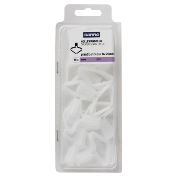 De GAMMA Hollewandplug PE plaat 16 -20 gebruik je voor het bevestigen van voorwerpen in gipsplaten en ander plaatmateriaal. Een hollewandplug (tuimelplug) heeft grote anti-rotatievleugels waardoor de plug niet meedraait wanneer je er een schroef indraait. Deze verpakking bevat 15 hollewandpluggen. Voor dit item adviseren wij een schroef te gebruiken met Ø 4mm en een lengte van 50mm.