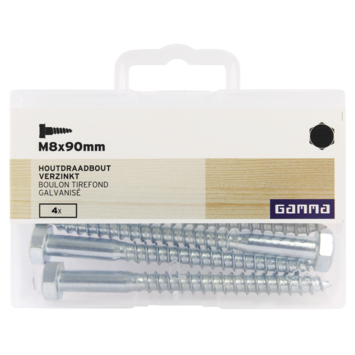 Deze houtdraadbout van GAMMA is gemaakt van verzinkt staal en heeft een zeskantkop en grof draad. De metrische maat van de bout is M8 en de lengte is 90mm. Deze bouten zijn erg geschikt voor het monteren van zware objecten aan betonnen muren in combinatie met de juiste plug. Ook kan je deze bout bijvoorbeeld gebruiken om buitenlampen en vlagstokhouders vast te maken in bakstenen. In combinatie met de juiste plug zorgt deze bout voor een muurvaste verbinding. Eén verpakking bevat 4 stuks houtdraadbouten.